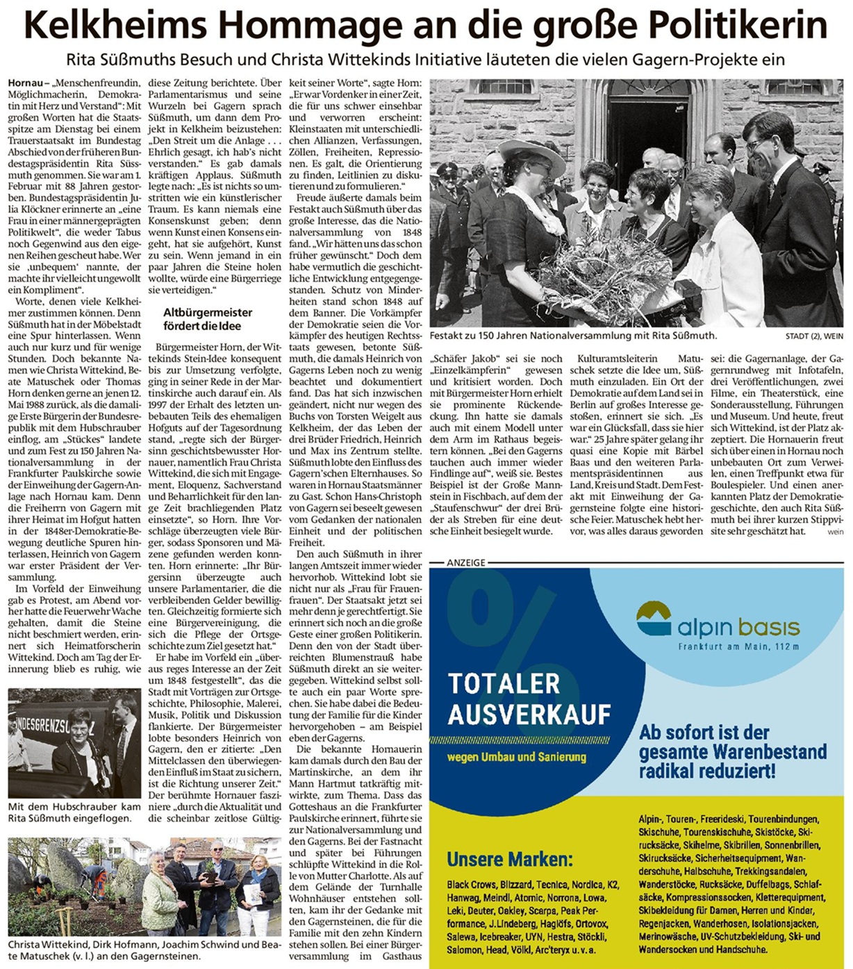 Höchster Kreisblatt: Rita Süßmuths Besuch und Christa Wittekinds Initiative