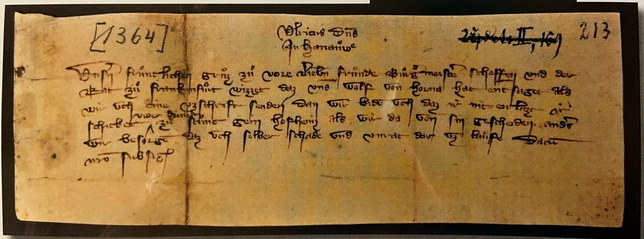 Fehdebrief des Wolf von Hornau aus dem Jahr 1364 (ein Sohn Kunos) an den Erzbischof von Trier, Bild aus dem Katalog Karolinger, Katalog zur Ausstellung im Museum Kelkheim